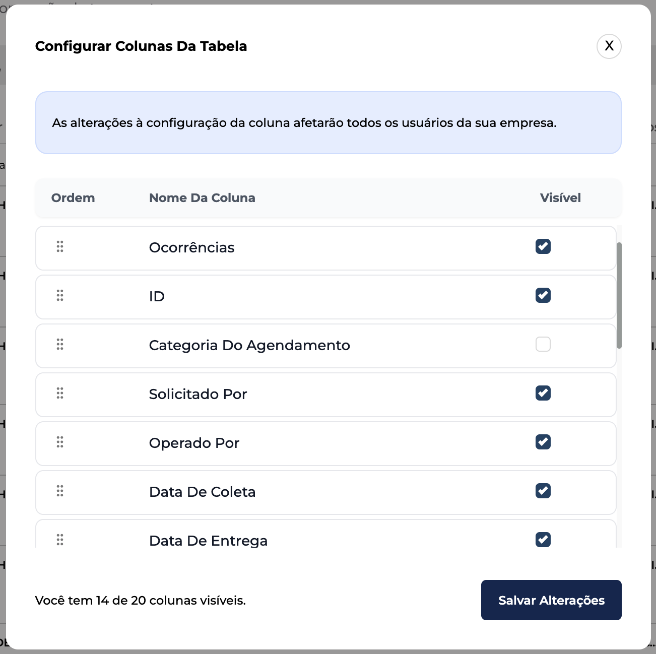 6. Após alterar a visibilidade e a ordem de todos os campos que desejar, clique em Salvar Alterações